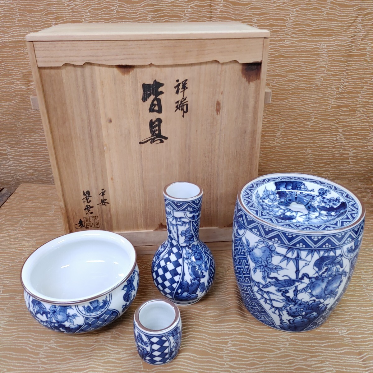 > 【皆具 祥瑞 茶道具 4点】平安景雲 作 水指 杓立 建水 蓋置 陶器 茶道 染付 共箱【A9-4】0826