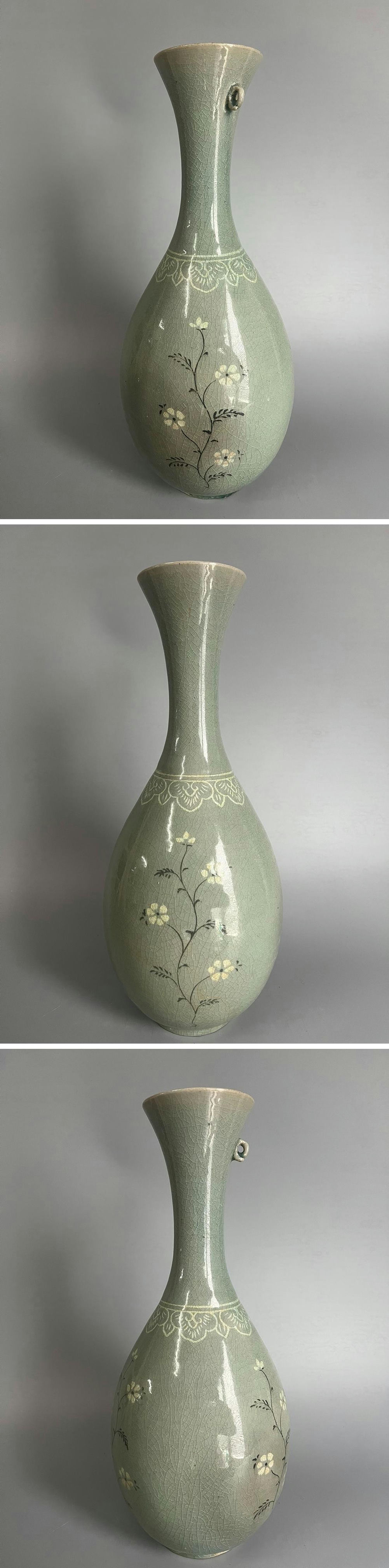 > ■観心・時代旧蔵■R9894朝鮮珍品旧蔵 朝鮮美術 高麗磁 朝鮮古陶磁器 古高麗 李朝 高麗青磁黒白象嵌菊花紋長頸瓶