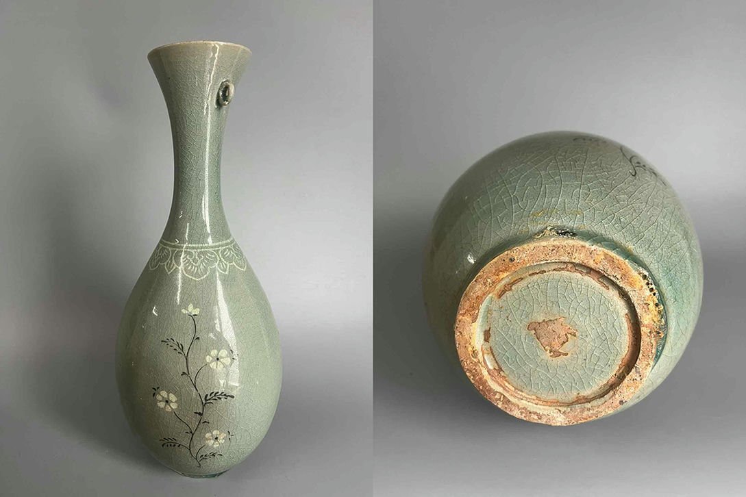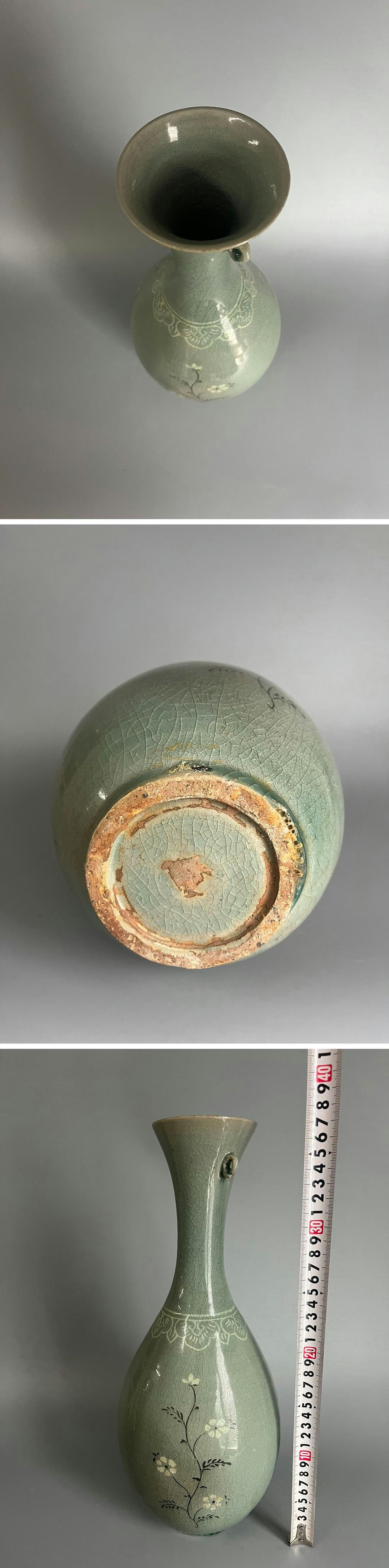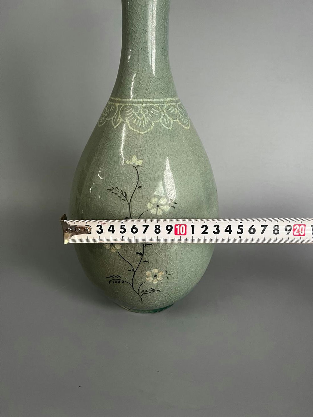- ■観心・時代旧蔵■R9894朝鮮珍品旧蔵 朝鮮美術 高麗磁 朝鮮古陶磁器 古高麗 李朝 高麗青磁黒白象嵌菊花紋長頸瓶