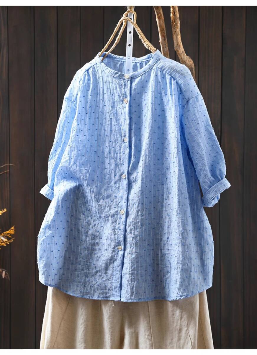 > 人気ワイシャツ フリーサイズ チュニック トップス 純色 織り込み柄 スタンド襟 綿100% ナチュラル 通気性肌触り抜群 ブルー系