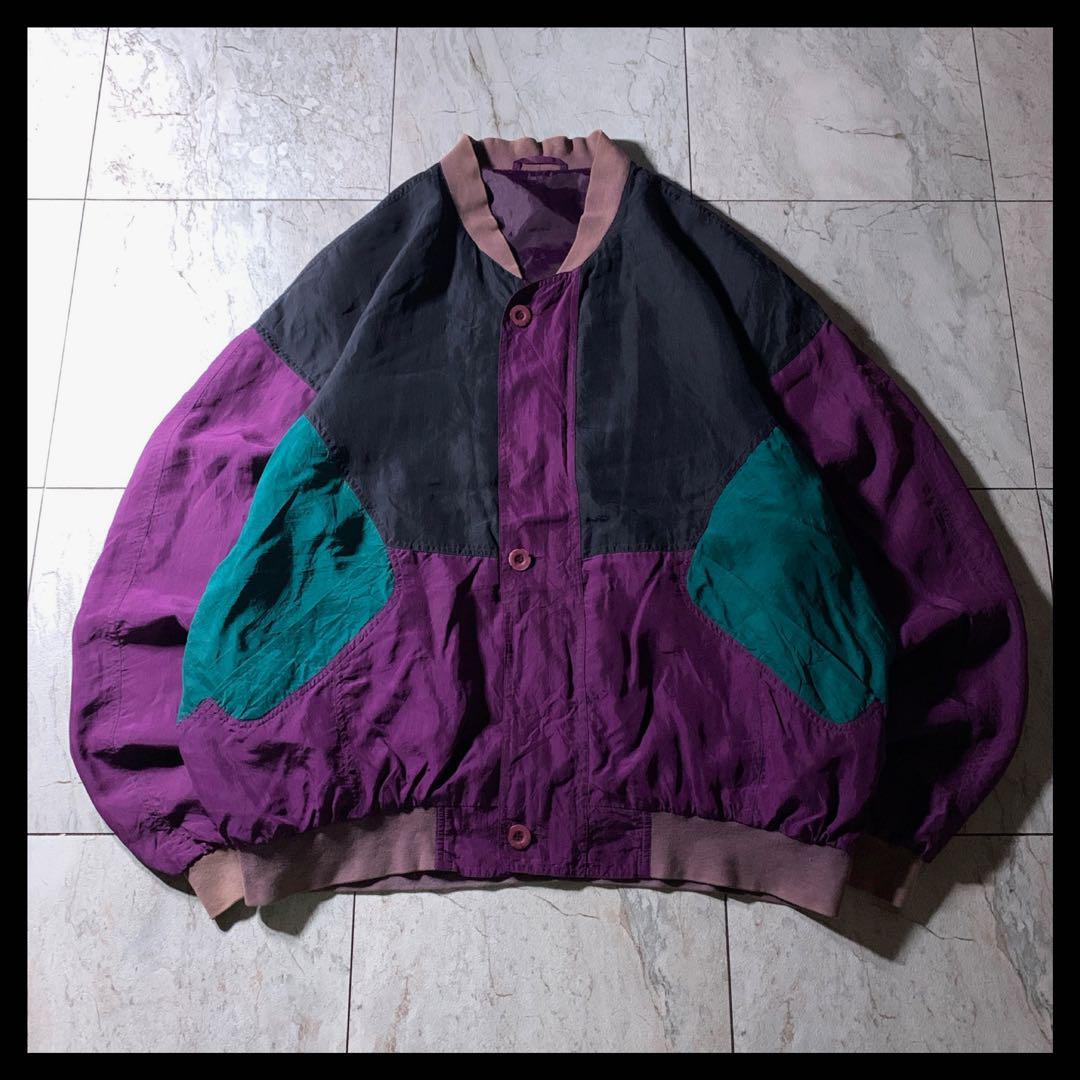 - レトロ古着 短丈 シルク スイングトップ ボンバージャケット 黒 緑 紫 切替