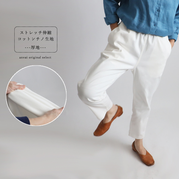 > 85cm 厚地ストレッチ伸縮コットンチノ生地 ゆるスッキリ穿ける 脚長パンツ 巻き縫いレギンス レギパン ホワイト F30