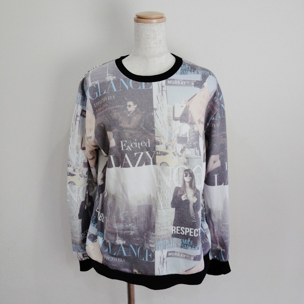 - 0828/LL/AVAILMODE レディース 長袖プルオーバー スウェット 裏起毛 総柄 黒