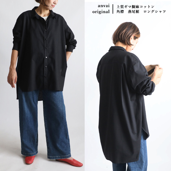 - 秋の新作 上質ギマ擬麻コットン 角襟 おしりすっぽり 燕尾裾 ロングシャツ 前開き ゆったり F56B