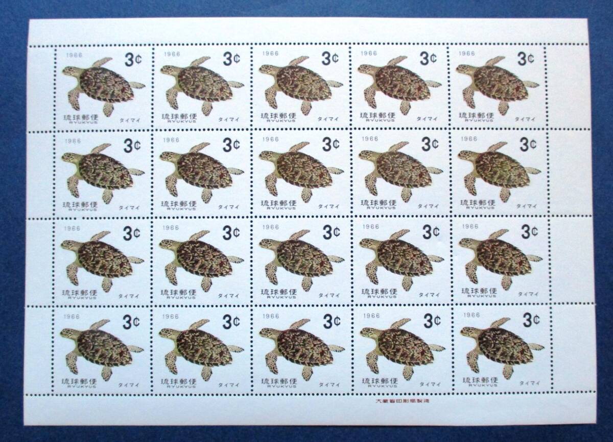 - 沖縄切手・琉球切手 カメシリーズ タイマイ 3¢切手 20面シート 140 切手1枚とシートミミにヨレがあります。