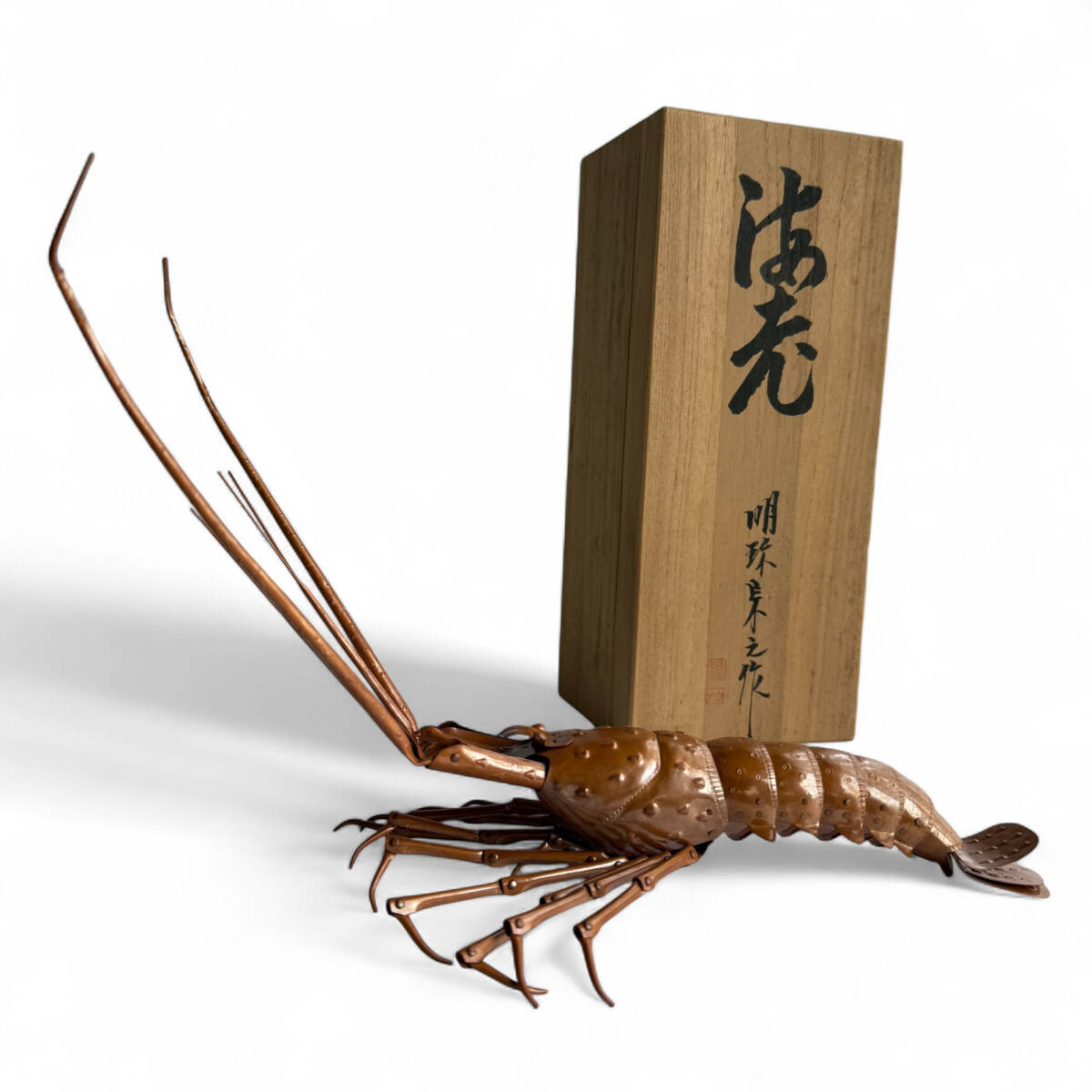 - M7-1227 明珍宗之 自在置物 海老 明珍本舗 五十一代 甲冑師 共箱 伊勢海老 縁起物 銅製