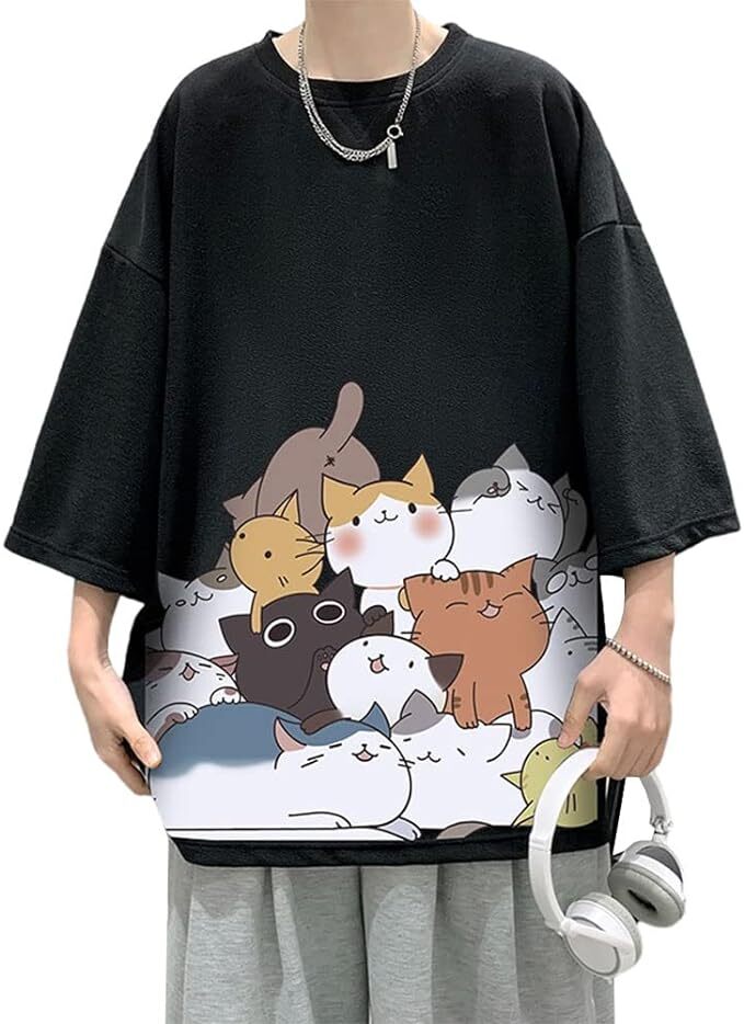 - 夏服 Tシャツ メンズ 半袖 トップス 無地 ゆったり 猫ロゴ XL