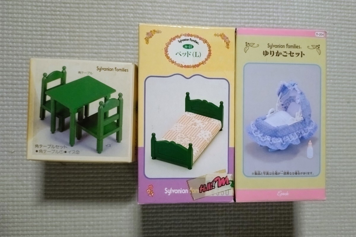 - シルバニアファミリー 家具セット3種 カ-01 角テーブルセット カ-07 ベッド (L) カ-204 ゆりかごセット