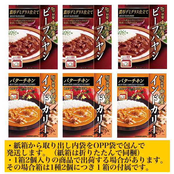 - ■新宿中村屋 ビーフハヤシ・インドカリー(バターチキン) 2種6箱■
