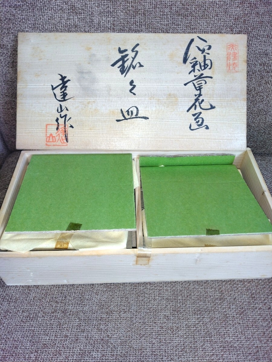 - K345【新品/長期保管】 灰釉草花画 銘々皿 5客揃 達山作 木箱
