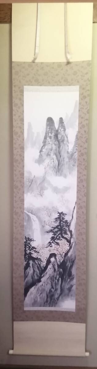 - [真作] 飛田周山 「白雲紅樹図」 肉筆 紙本掛軸 約218cm 日本画 天然軸先 共箱 極めて幻想的な山水図 滝が流れる様 紅樹の紅一点の美しさ
