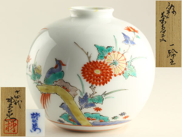 > 日本美術 人間国宝 十四代 酒井田柿右衛門 錦 菊鳥文 一輪生 共箱 H3006