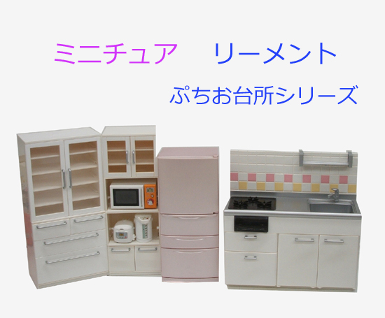 ◎ミニチュア リーメント ぷちサンプル 4点セット ぷち冷蔵庫 たっぷりさん(ピンク)・ぷちお台所 ホワイト 食器棚、クックさん、家電棚(小型家電付) 札幌市 平岸店