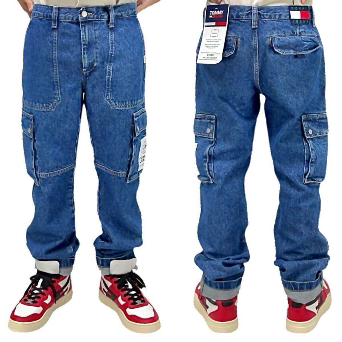 - 新品 TOMMY JEANS トミージーンズ ハイウエスト レギュラー テーパード ミリタリー ミドルウォッシュ ブルー デニム カーゴパンツ W32 L34