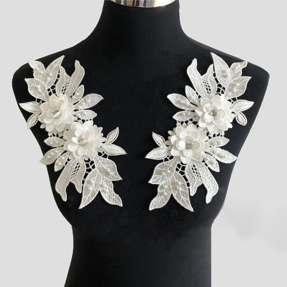 - AZ157ホワイト*2枚セット 立体お花モチーフレース 襟レース 胸元モチーフ 刺繍レース ビーズ パール付き 新体操 衣装 社交ダンス