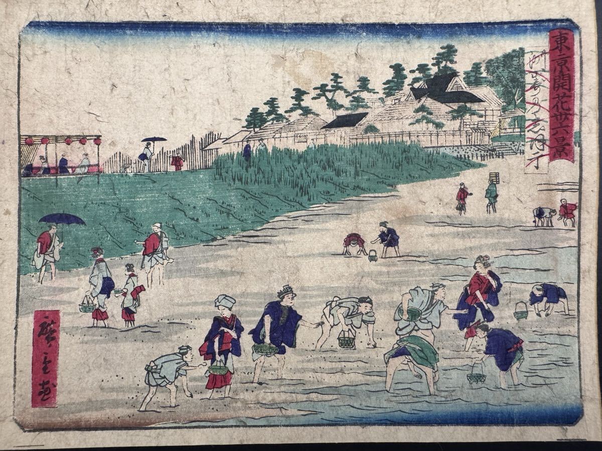 - 【真作】本物浮世絵木版画 歌川広重「東京開化三十六景 洲崎のしほ干」明治期 名所絵 錦絵 中判 保存良い 裏打ち