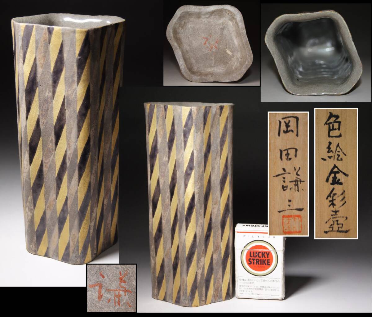 - 真贋保証■岡田謙三 作■ 色絵金彩壷 共箱 金銀彩 ストライプ 縞文 角形 壺 花器 花生 花入 飾壷 東京生 益子焼