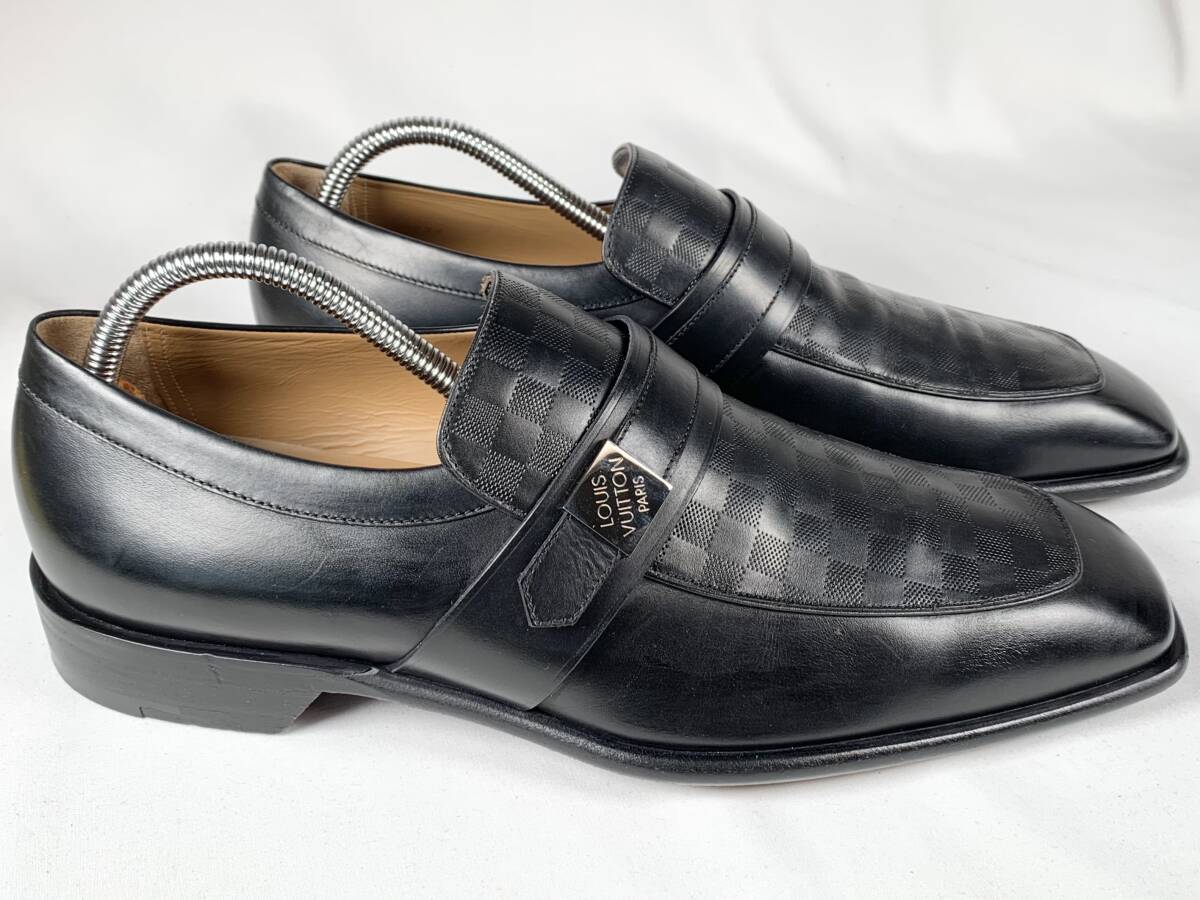 > 【正規品】極美品 ルイヴィトン LOUIS VUITTON ダミエ グラフィット LV レザー ローファー ビジネス ドレス シューズ 革靴 メンズ 8 1/2 黒