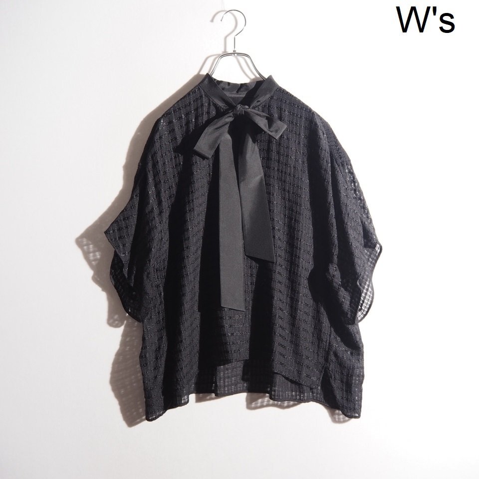 - R1034P ▼Drawer ドゥロワー▼ エンブロイダリー シアーチェック ネックリボン 半袖 ブラウス ブラック / 6521-299-1016 黒 春夏 rb mks