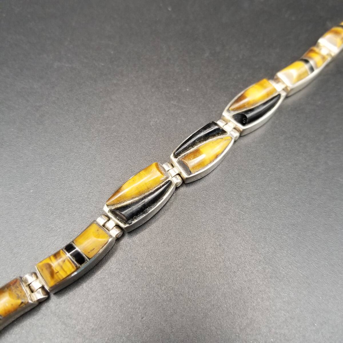 > ESCORCIA メキシコ 950 シルバー タイガーアイ オニキス ウェーブチェーン ヴィンテージ ブレスレット 銀 Taxco 重厚感 Y24-J