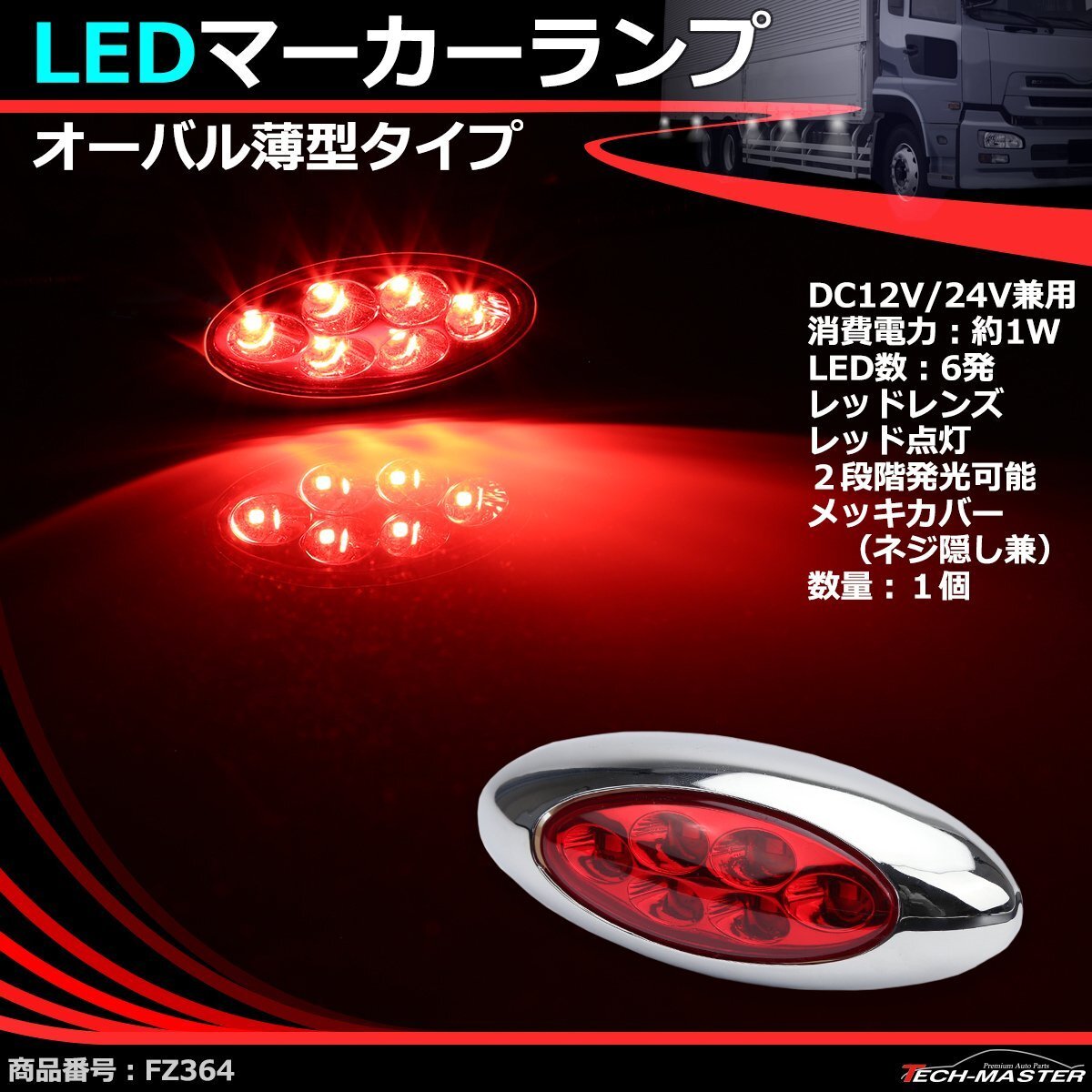 > LEDマーカーランプ オーバル形状 DC12V/24V兼用 2段階点灯 汎用 LED6発 レッドレンズ レッド点灯 トラック サイドマーカー FZ364