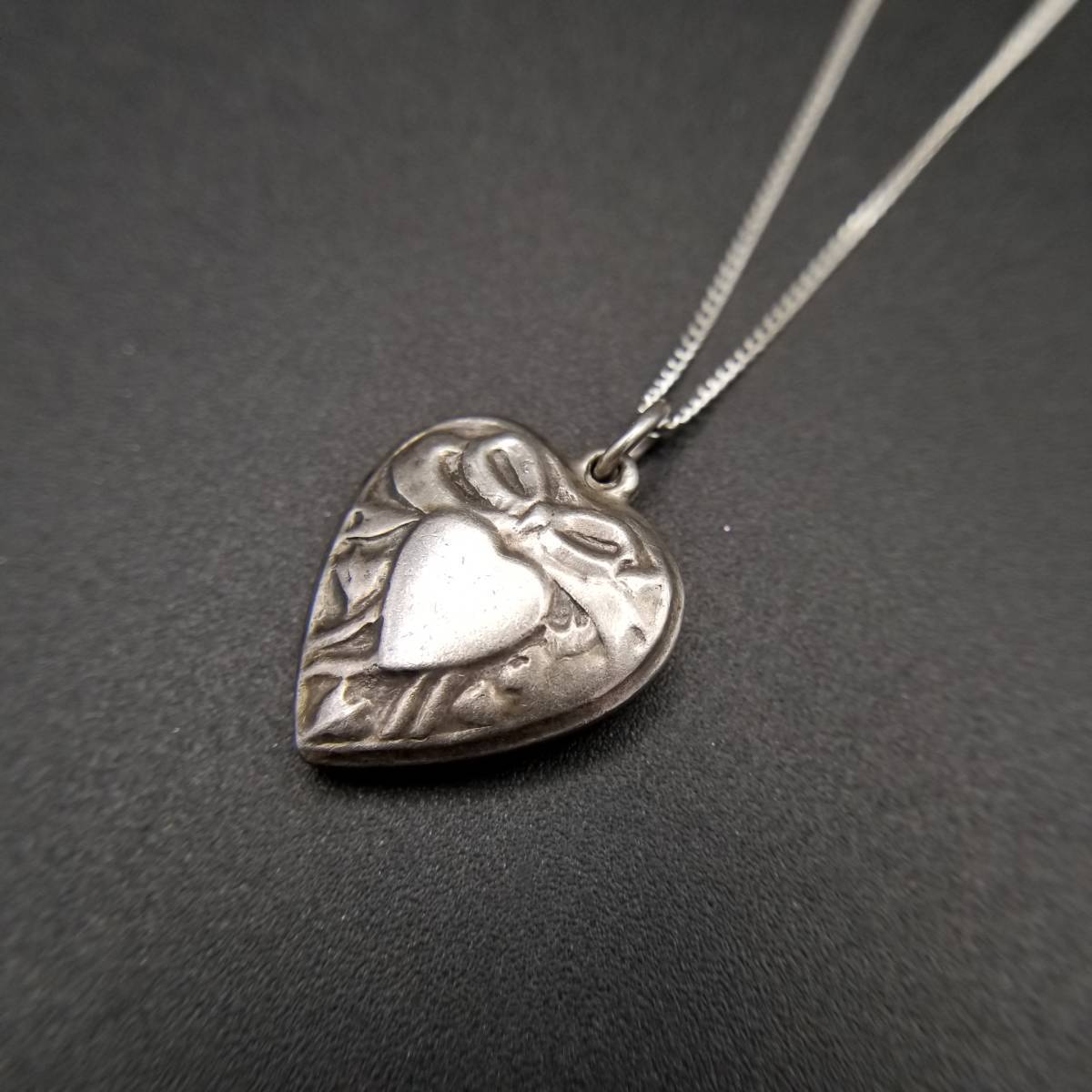 - WWII期 ヴィンテージ スウィートハートジュエリー リボンをかけたハート 925 シルバー ネックレス ペンダント 銀 Puffy Heart Y12-G