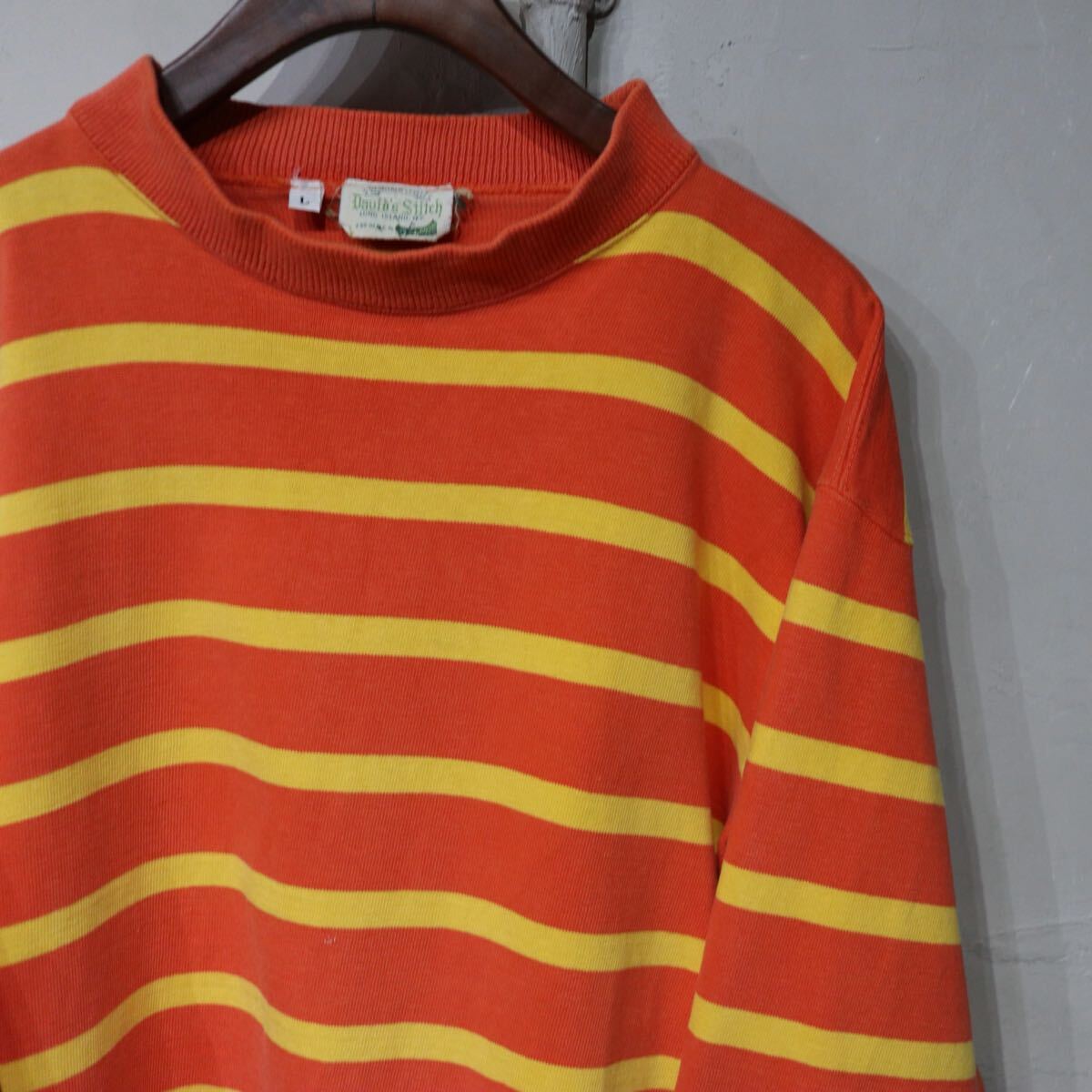 > 【即決】ボーダー カットソー モックネック オレンジ イエロー 長袖 USA アメリカ製 オールド 古着 ヴィンテージ L