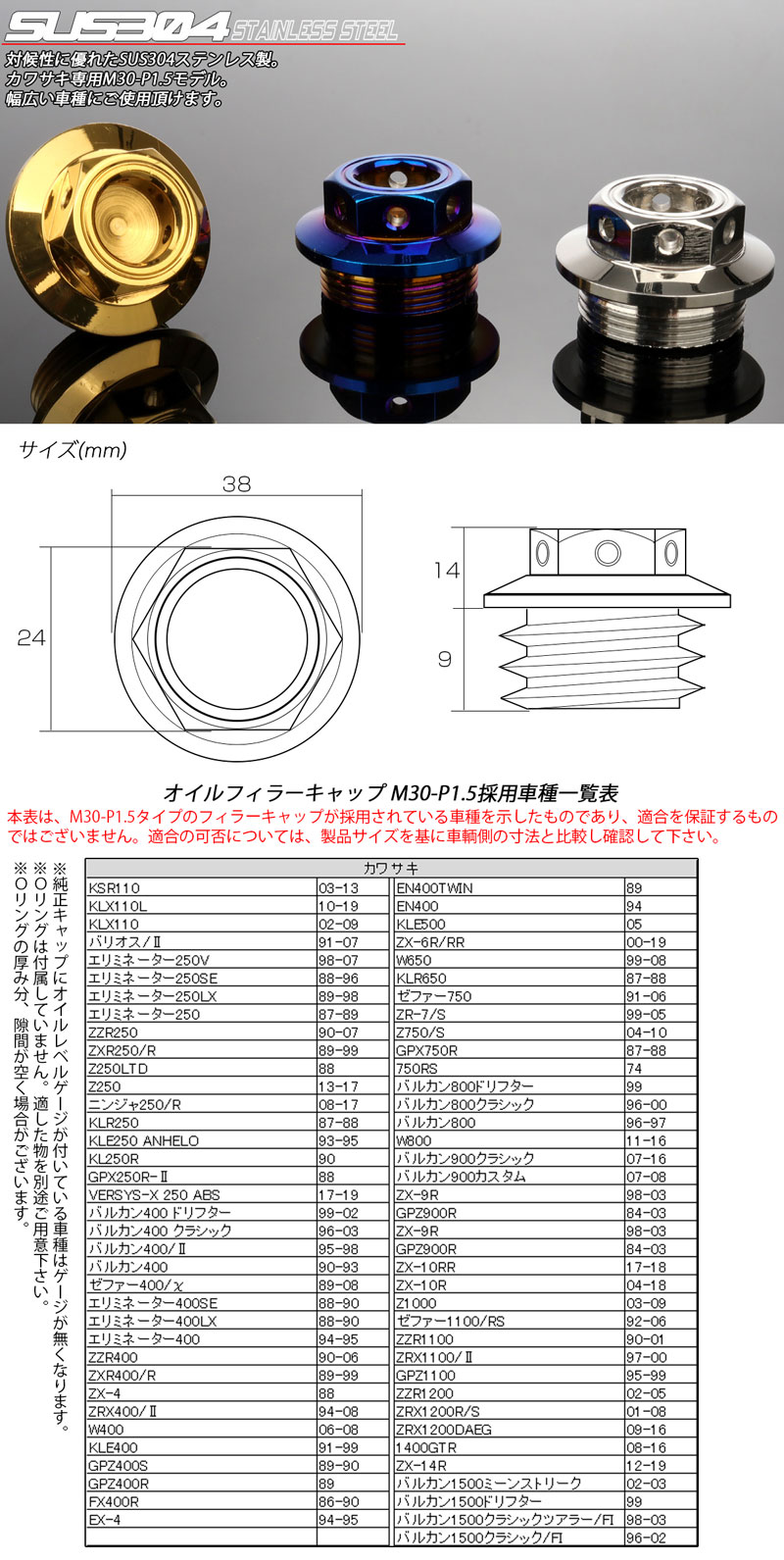 > 汎用 オイルフィラーキャップ M30 P1.5 ゴールド SUS304 ステンレス カワサキ TH0257