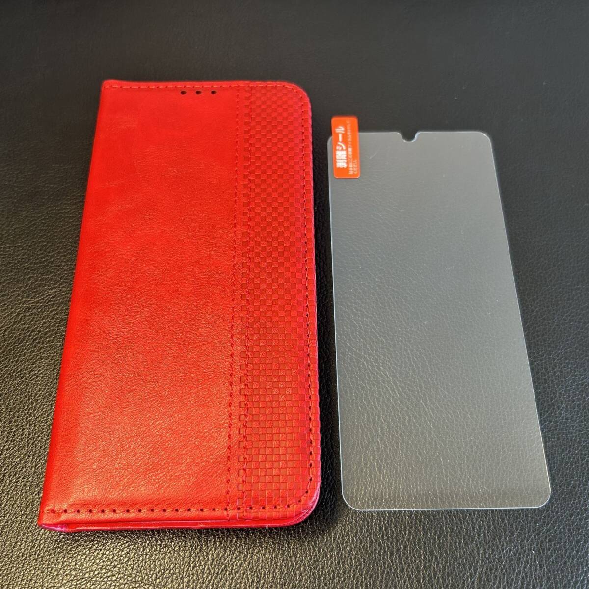 > 2点セット arrows We2 F-52E FCG02 レザーケース レッド+ガラスフィルム 手帳型 保護ガラス カード収納 アローズ