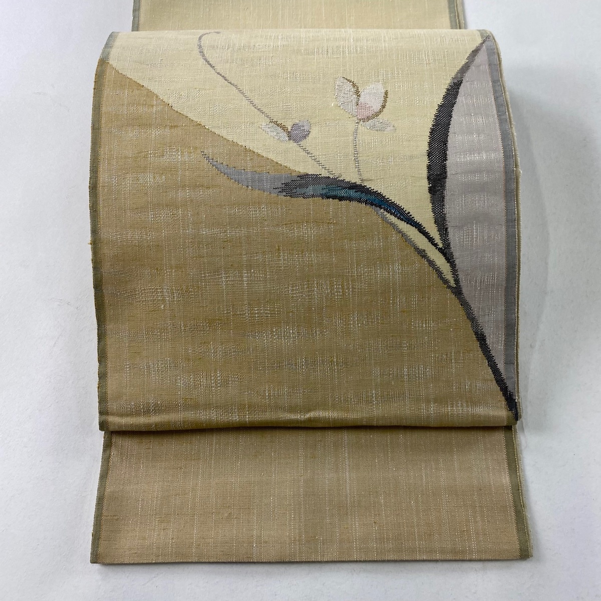 - 袋帯 美品 秀品 紬地 草花 金糸 ベージュ お太鼓柄 正絹 【中古】