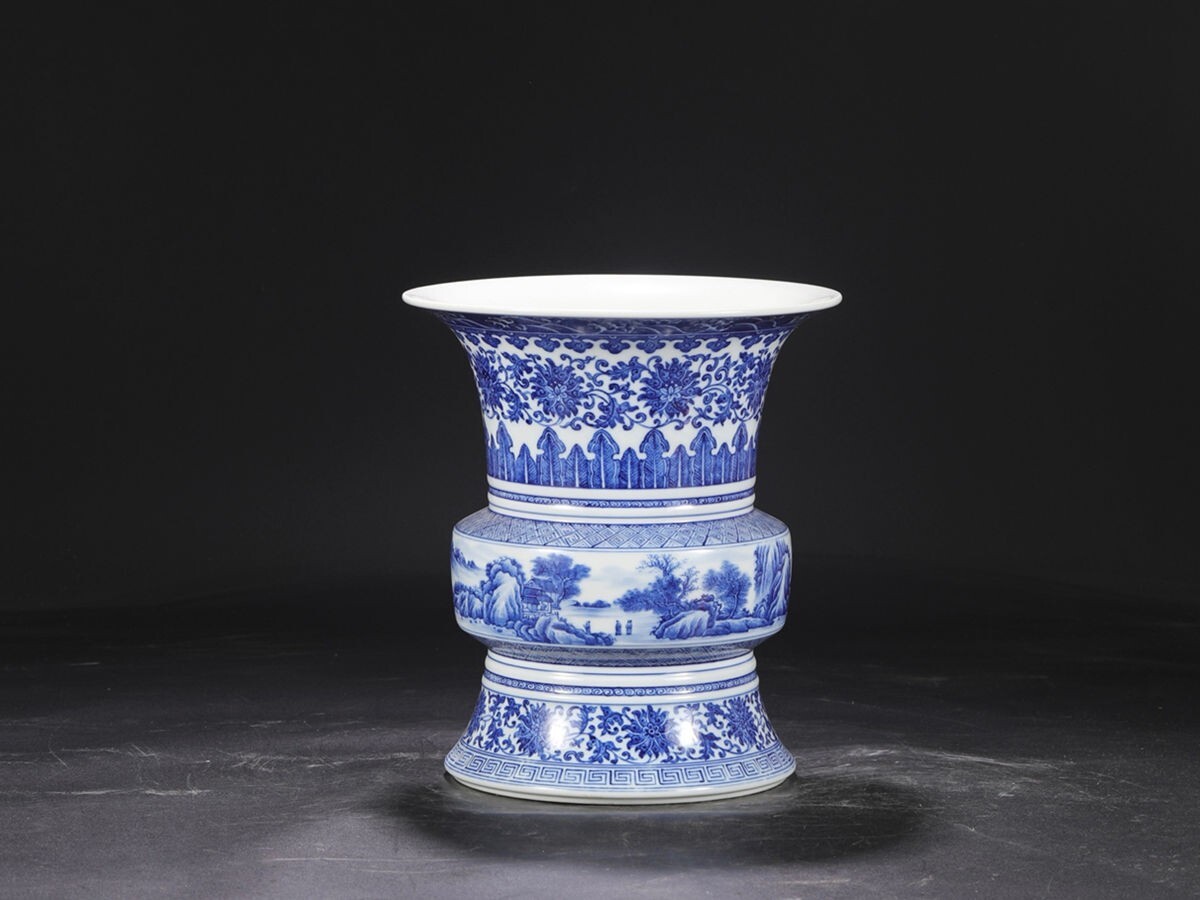 - 「清 乾隆年製 陶磁器 青花纏枝蓮山水人物 大花孤」染付 置物 擺件 古賞物 中国古美術 旧蔵出