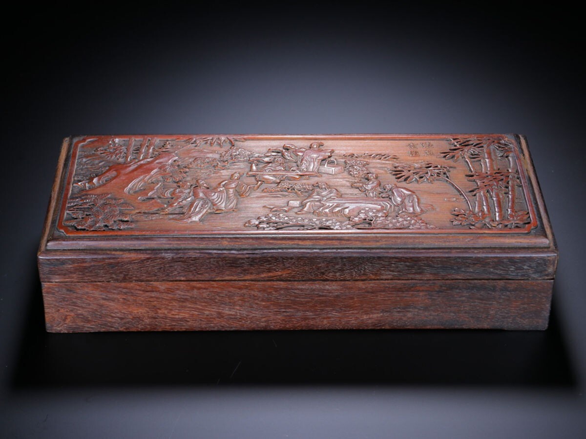 - 「清代 張熊製 老紅の木 嵌竹彫り 人物故事 蓋盒」極細工 擺件 賞物 古美術 骨董品 蔵出