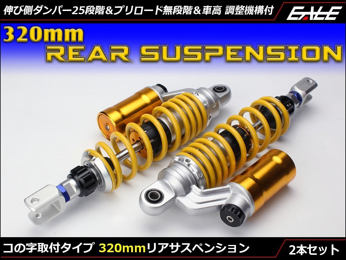 > 320mmコの字取付 リザーバータンク付き リアサスペンション 2本セット 伸び側ダンパー25段階 プリロード無段階 車高調整 ゴールド S-561