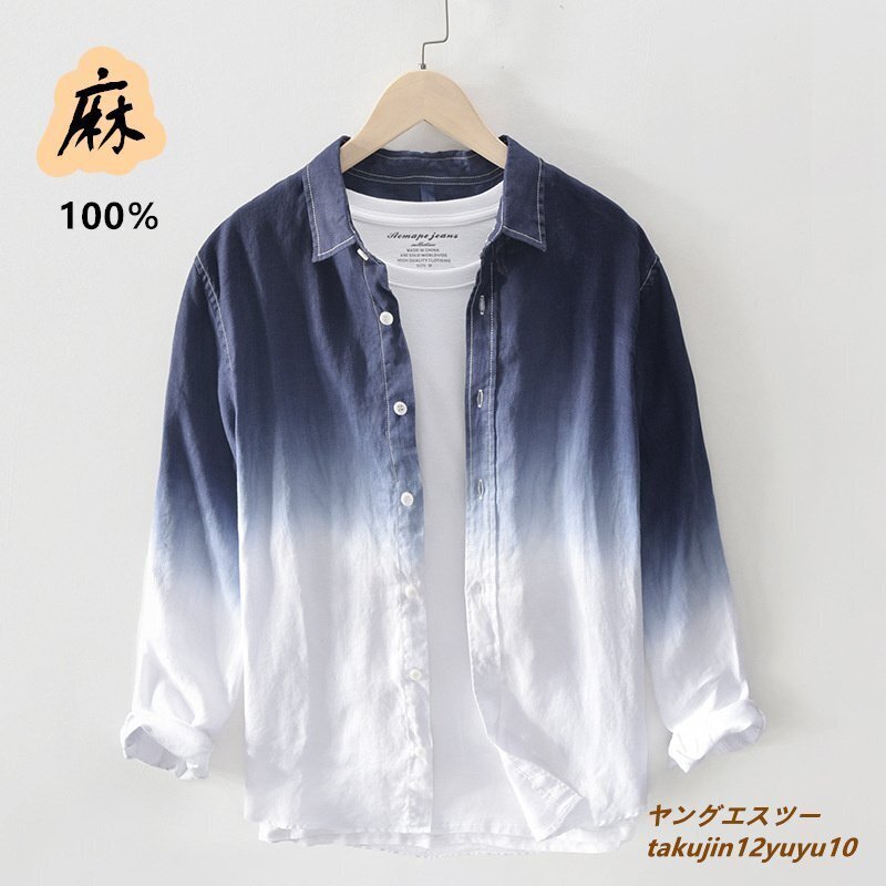 > 長袖シャツ リネンシャツ 新品 メンズ Tシャツ 亜麻100% ワイシャツ 極美品 個性 グラデーション 紳士 トップス 2WAY 細身 ネイビー XL