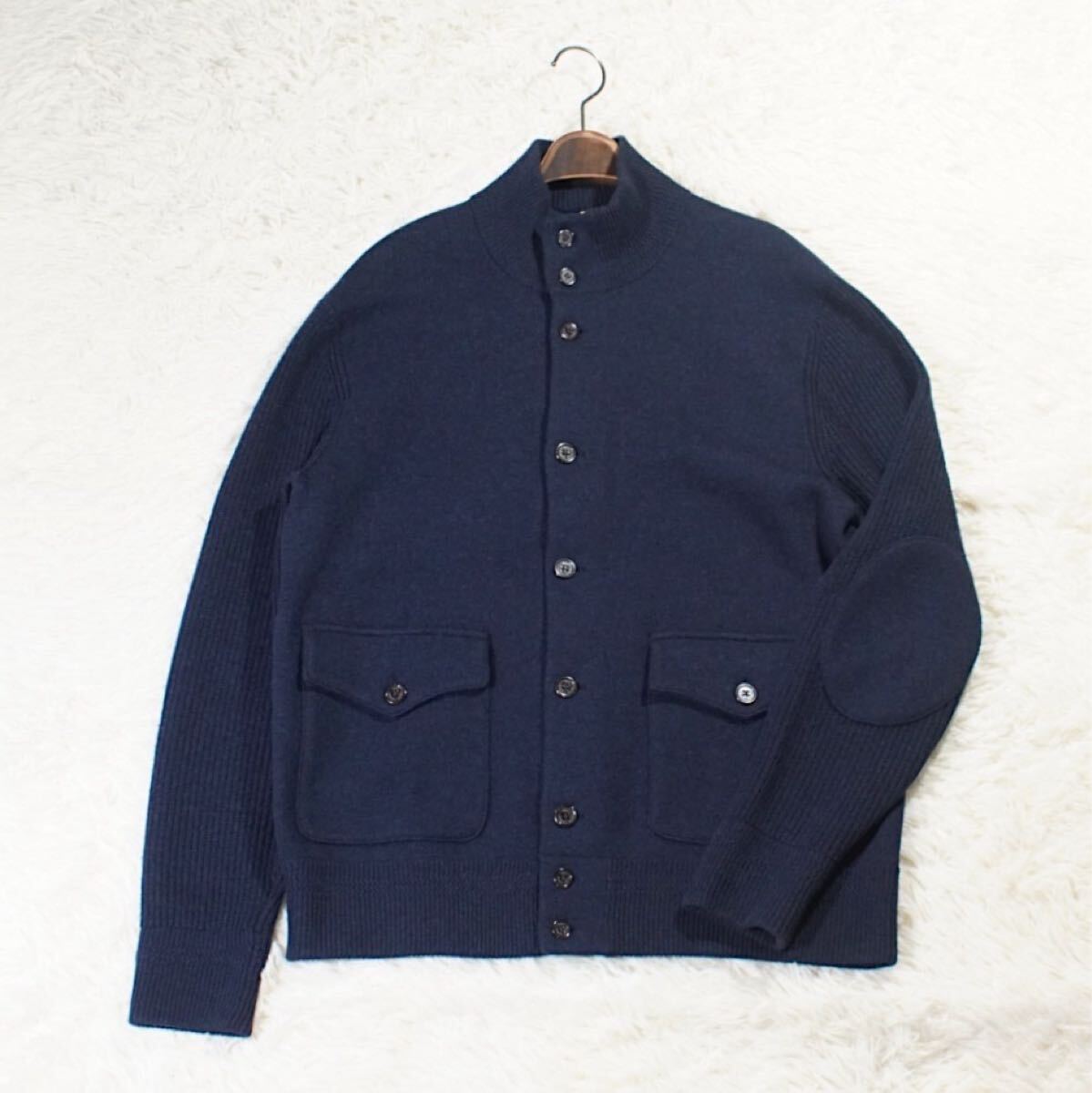 - 即決 クリーニング済み カシミヤ《ポロラルフローレン》スタンドカラー ニットジャケット(L)ネイビー エルボーパッチ POLO RALPH LAUREN