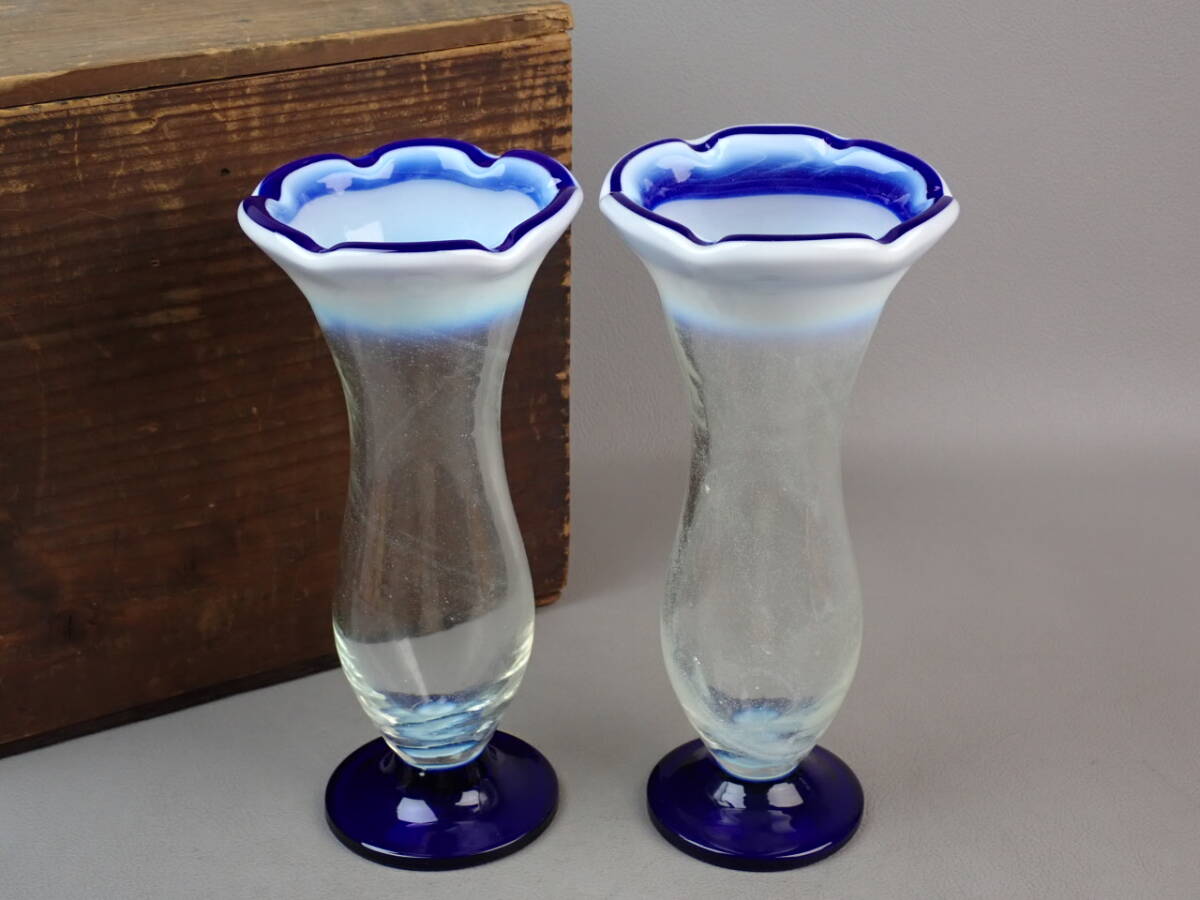 > 【骨董・茶道具】★古い ガラス★★青縁乳白氷コップ 一対 go023xb パフェグラス アイスクリームグラス レトロ アンティーク
