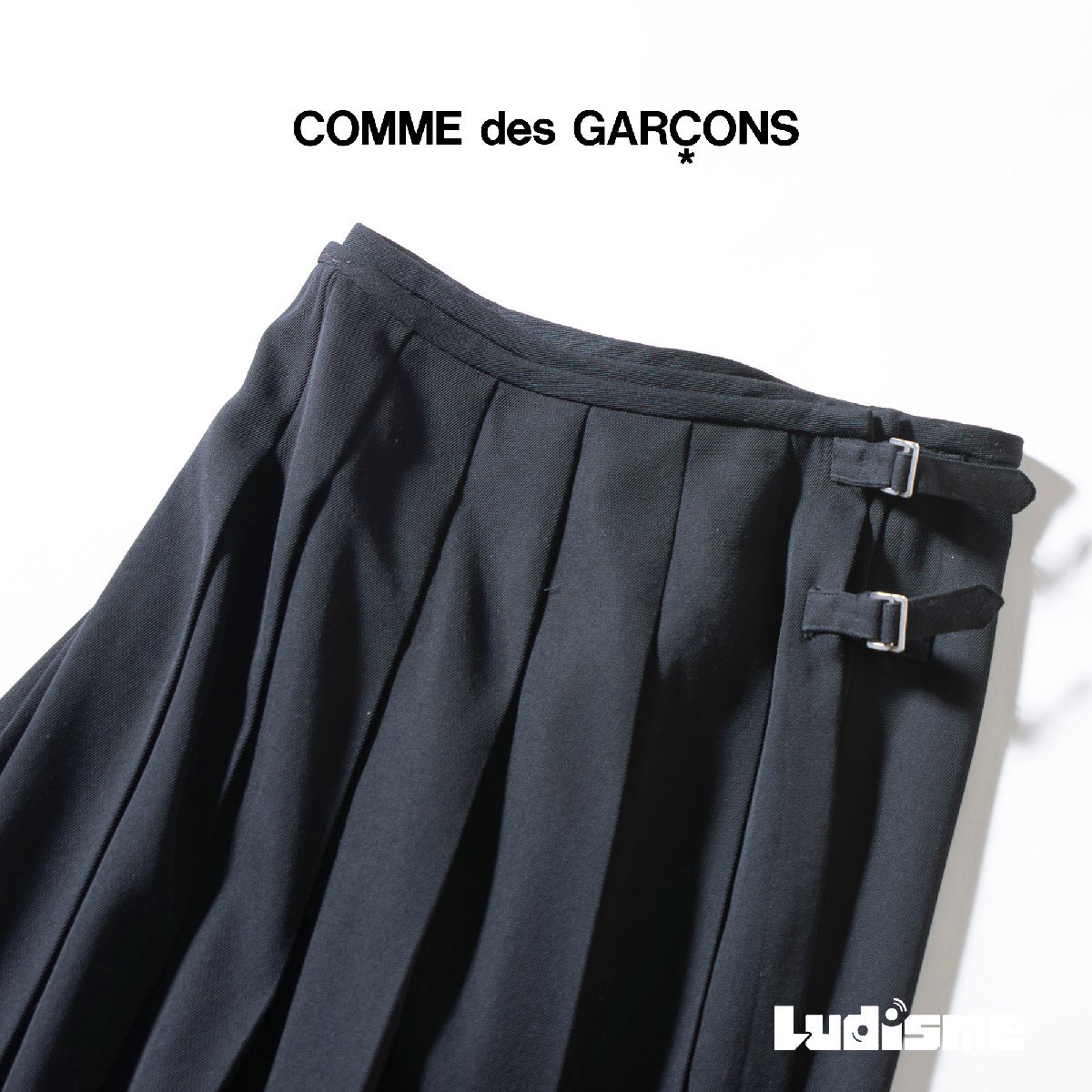 プリーツスカートとパンツを融合させた再構築的デザインは、川久保玲ならではの前衛的なアプローチを体現。