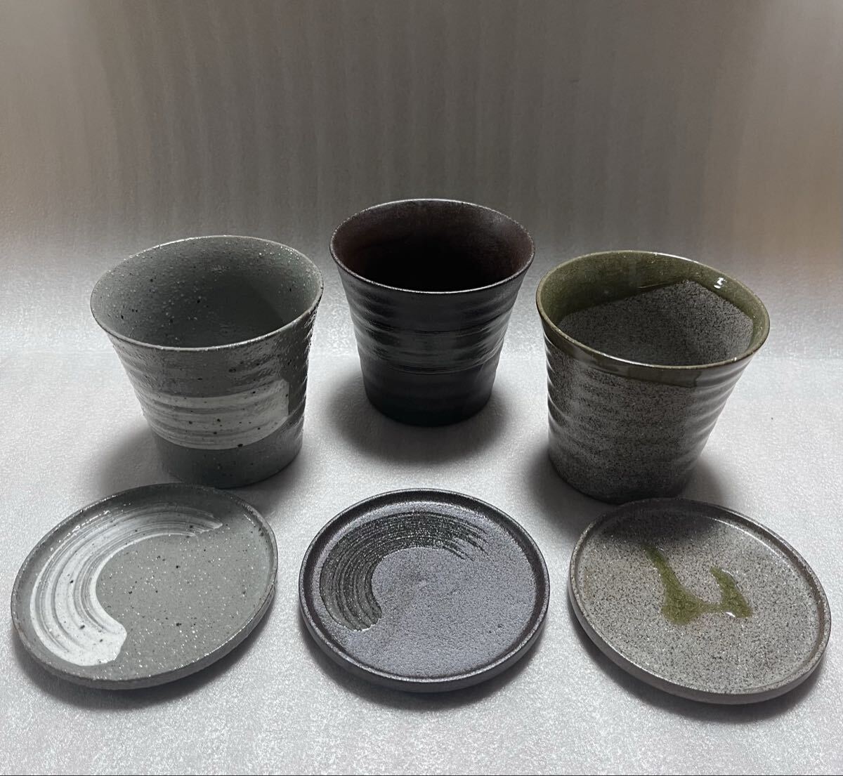- 未使用 新品 美濃焼 フリーカップ 小皿 3客 6点 セット お洒落 カップ タンブラー グリーン グレー ブラック