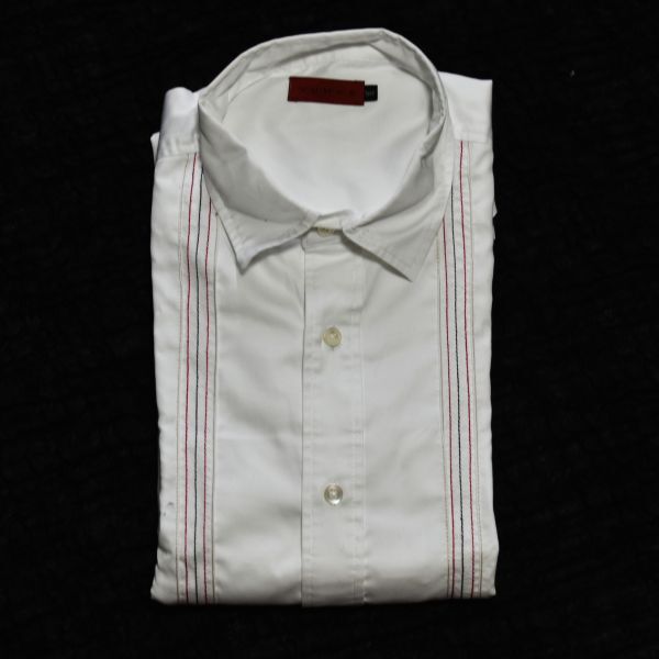 > ★美品★VUMPS★ヴァンプス ★ 赤白グリーンの5本ステッチのストライプ★ ショートカラーの長袖ドレスシャツ 50/L