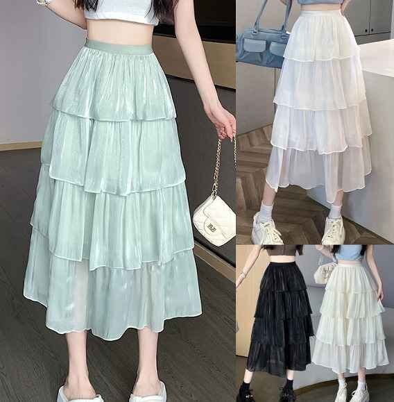 - 全4色 スカート ハイウエスト フリル 切り替え 体型カバー 着痩せ 無地 sweet系 L ホワイト