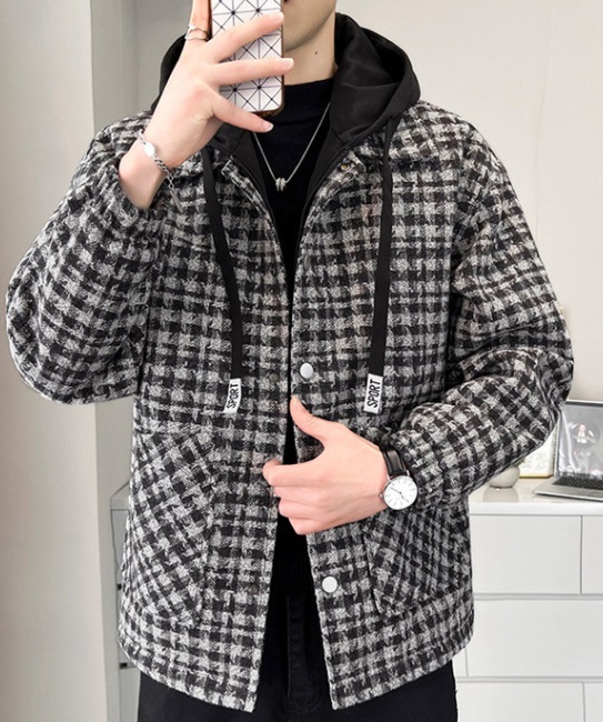 - 新作 秋冬 チェック柄ジャケット 裏ボア ブルゾン フェイクインナー 作業服 厚手 アウターフード付き 黒/M