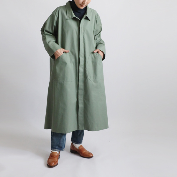 > 秋支度 Aライン ロング コート ワンピース 大きな丸ポケット 後ろスリット入 ベビーキャンバスコットン ライトグリーン T09B