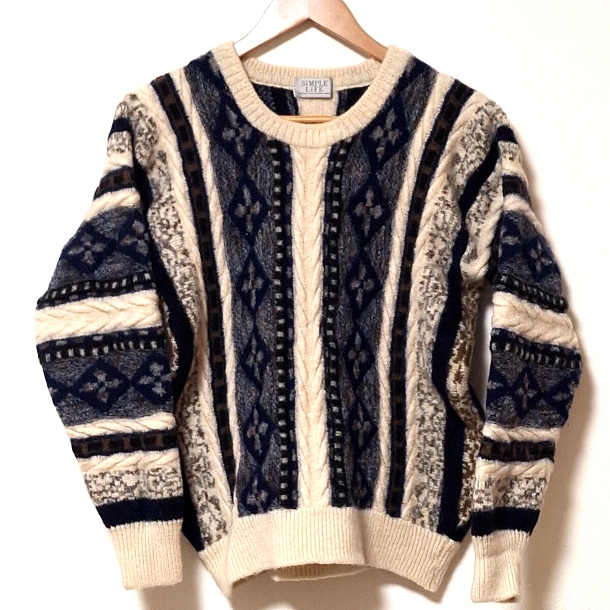 - W66【SIMPLE LIFE】シンプルライフ セーター ニット 長袖 ショート丈 厚手 個性的 柄 ウール ネイビー レディース サイズL /QQ