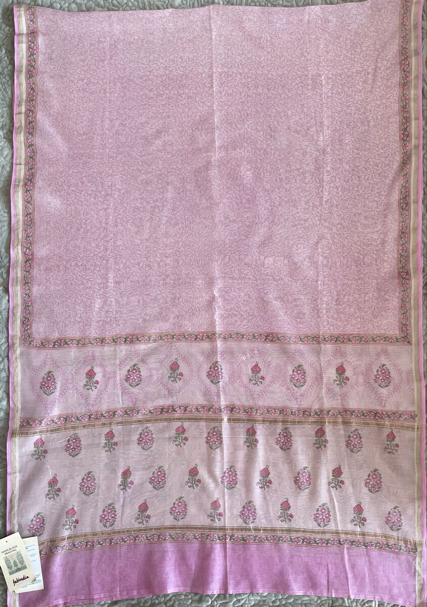 - 未使用タグ付きfabindia大判 クロス ハンド ブロック プリント 花柄 コットン シルク ピンク ピーチ ファブインディア インド製