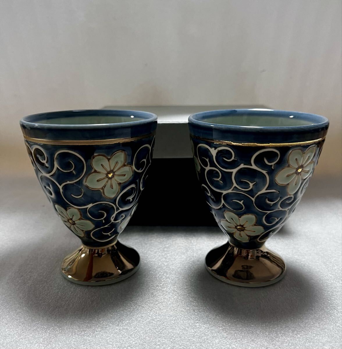> 未使用 新品 波佐見焼 龍庵窯 金彩 唐草 ゴブレット 2客 ワイングラス ワイン ペア 唐草桔梗 花 酒器 豪華 お洒落 青 箱入り