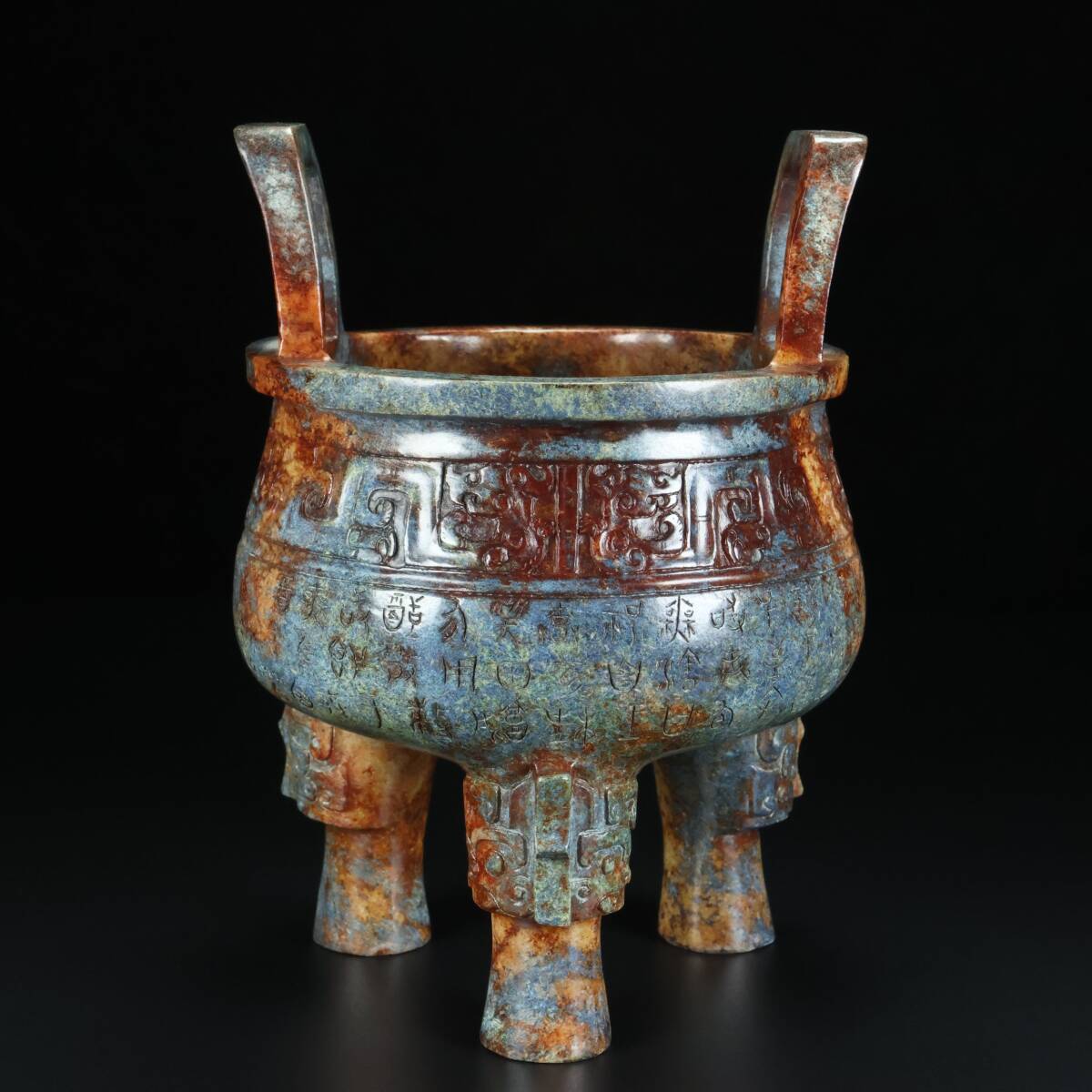 - ◆珍蔵◆中国古美術 高古玉 和田玉彫り銘文三足鼎 細密細工造 置物 擺件 古賞物 時代物 AT17