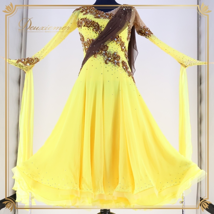 - 社交ダンス 衣装 スタンダードドレス スタンダード ワンピース ドレス デモ 競技 フロート 黄色 茶色 ブラウン系 レース イエロー系