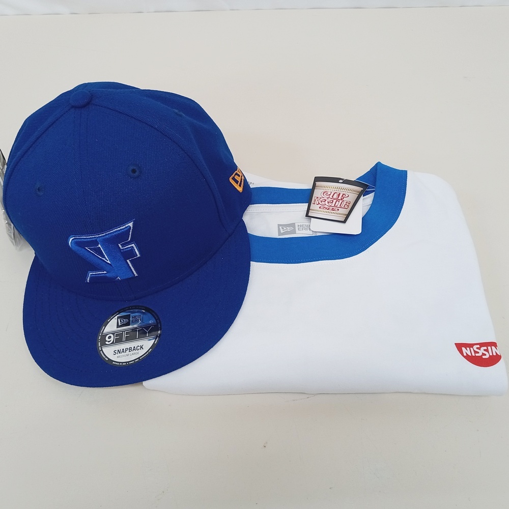 - ●古5036 日清×NEWERA ニューエラ シーフード味 キャップ Tシャツ まとめて XLサイズ タグあり【68】