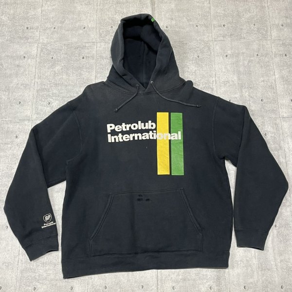 > BP 裏起毛 フーディー ブラック 両面プリント ブリティッシュペトロリアム スウェット パーカー フロッキープリント 石瀬7245