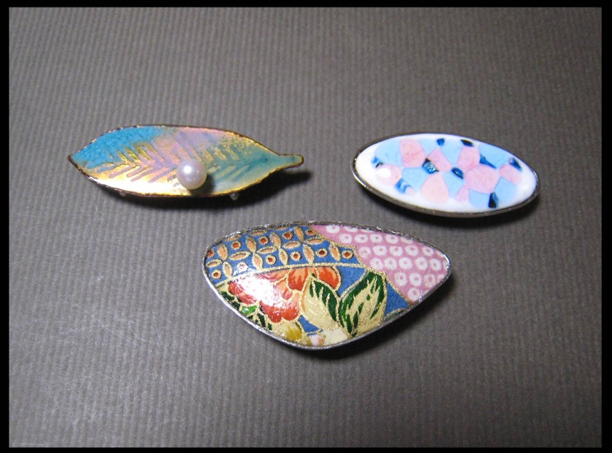 - 七宝焼き 葉っぱ型 パール飾り 楕円形 ピンクと水色 レザークラフト 花文 貝型 帯留 3点 着物 帯飾り 和装小物